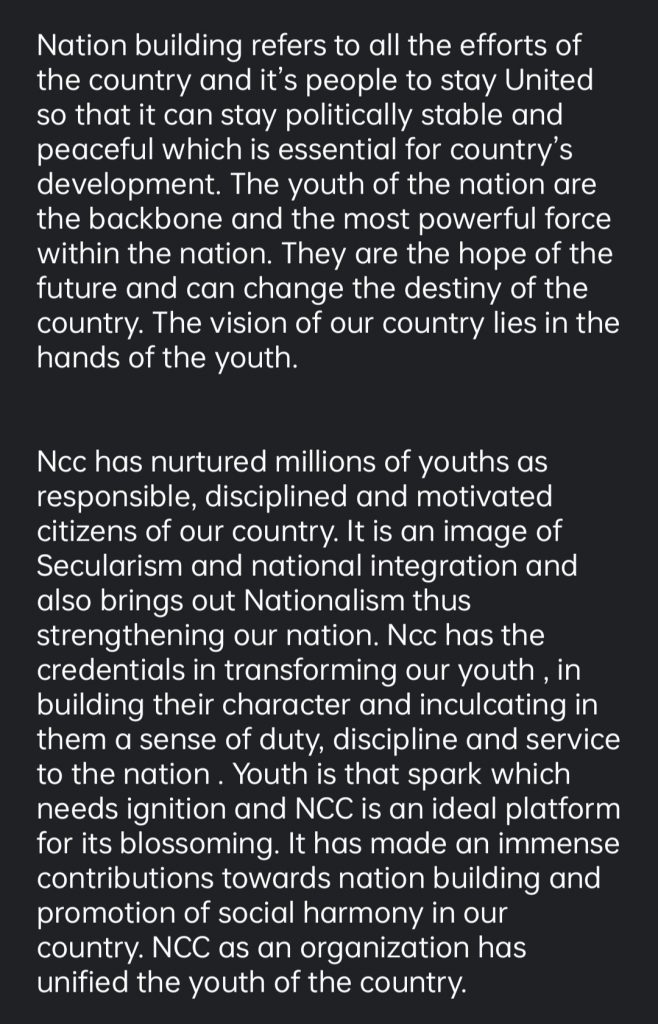 Nation building refers to all the efforts of the country and it’s people to stay United so that it can stay politically stable and peaceful which is essential for country’s development.