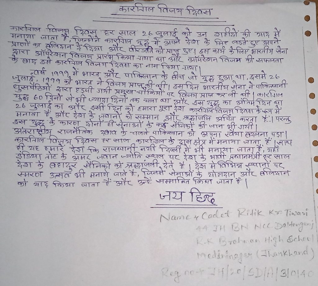 Name- Cadet Ritik kumar Tiwari 44JH BN NCC Daltonganj. Rk Brahman High School Medininagar (Jharkhand)