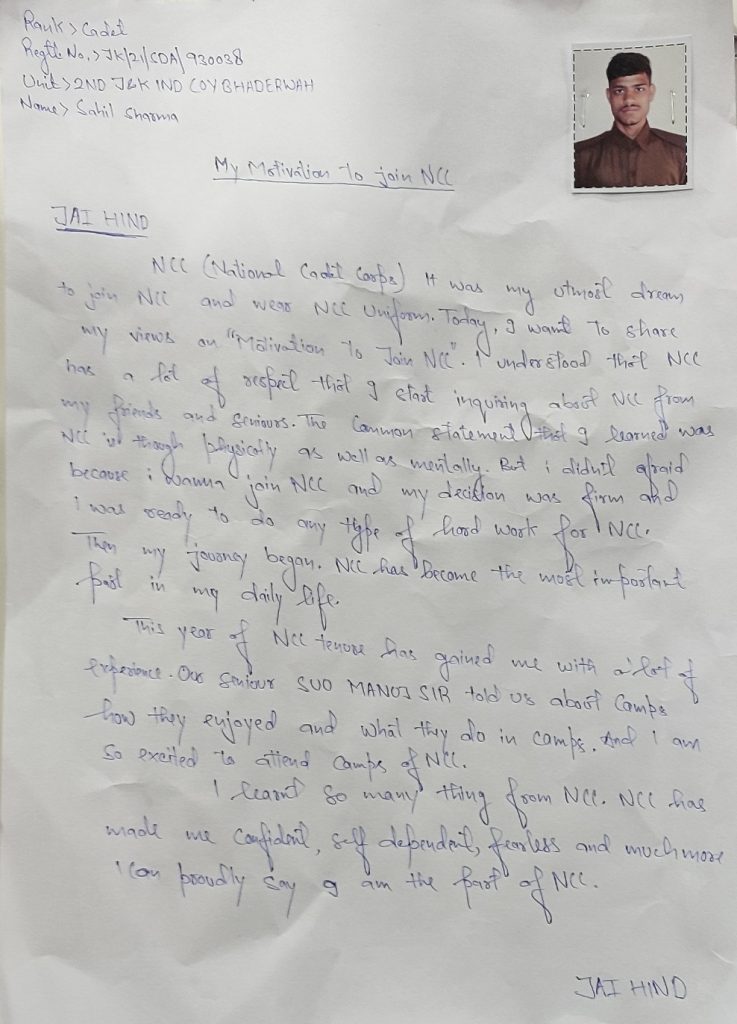 Cadet. Sahil Sharma Regtt. no. JK/21/SDA/930038 UNIT. 2ND J&K IND COY BHADERWAH