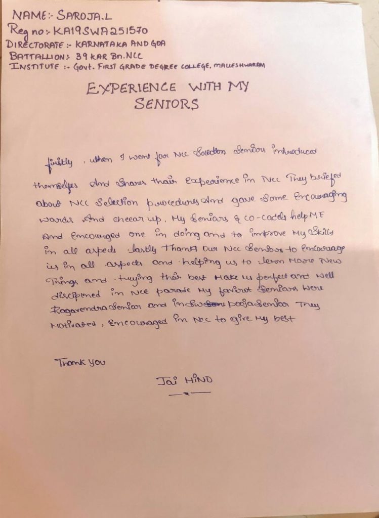 Saroja.L Studying in 4sem 2b.com Cadet of government first grade degree college, malleshwaram Cadet