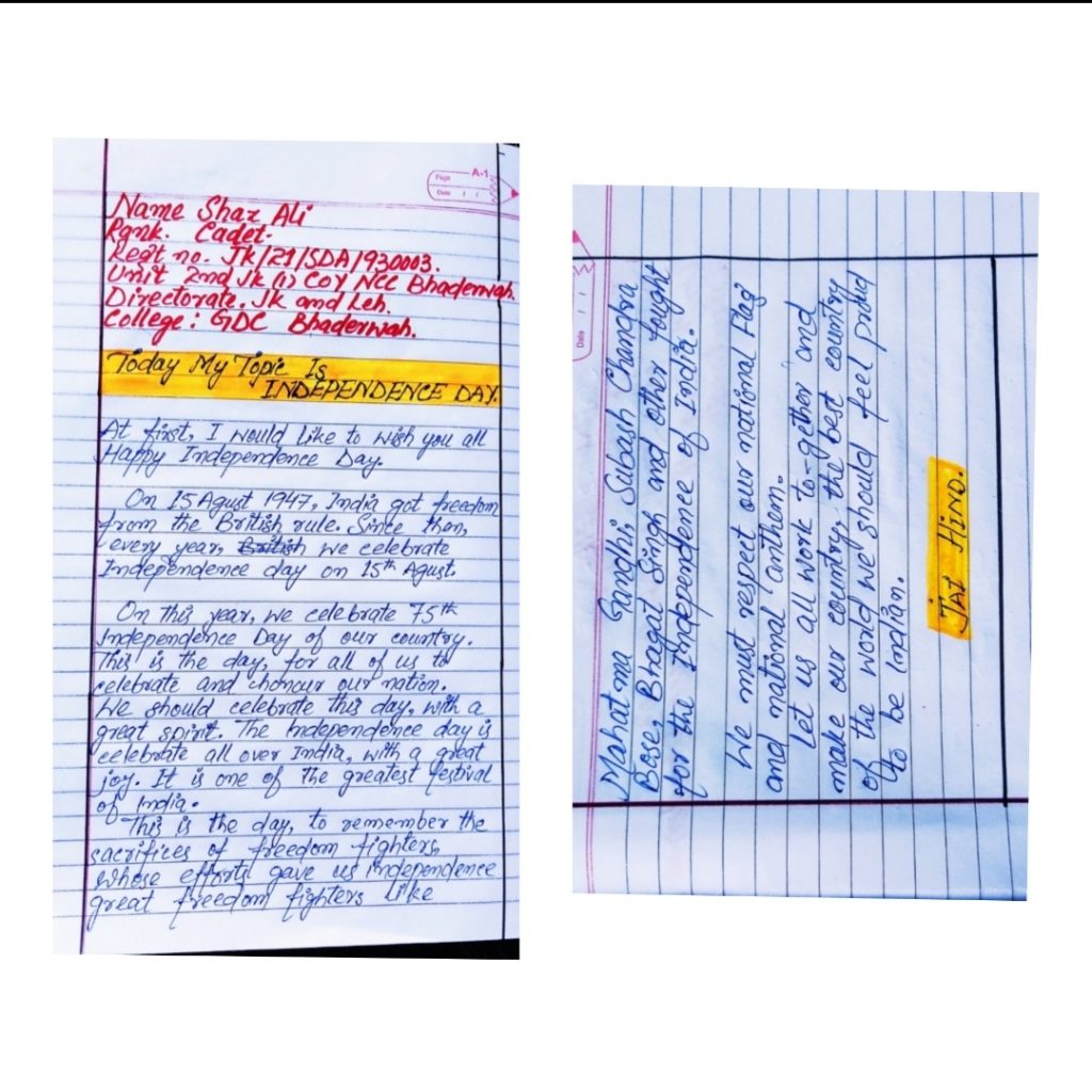 Cadet Shaz Ali Regt no JK/21/SDA/930003 Unit 2nd JK (I)COY NCC Bhaderwah
