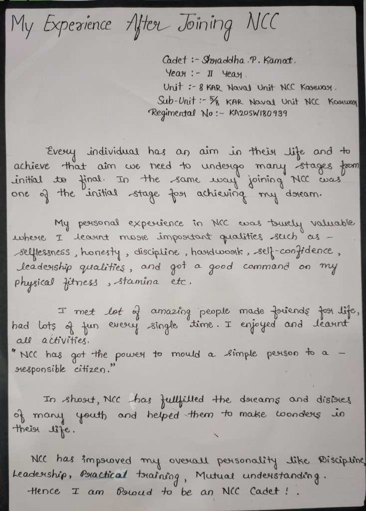 I'm Cadet Shraddha P Kamat I will appear 'B' certificate in 2022 My regimental no. is KA20SW180939
