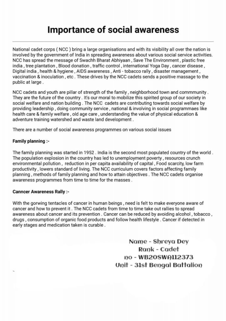 This is cadet Shreya Dey , WB20SWA112373 , 31st BENGAL BATTALION NCC , KOL - B GROUP , WEST BENGAL & SIKKIM DTE . This is my article on social awareness . Thank you , Jai Hind .