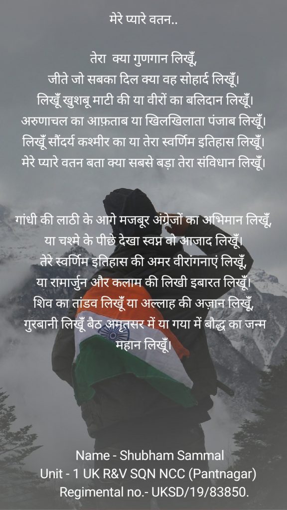 Shubham Sammal, Unit- 1UK R&V SQN NCC (Pantnagar), Regimental no.- UKSD/19/83850 यह कविता भारत के परिचय और गरिमा का संक्षेप में वर्णन है।