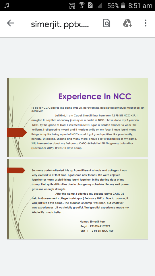 Name : Simerjit Kaur 12 PB BN NCC HSP I shared my experience in Ncc