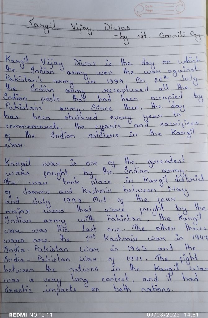 Article on Kargil Vijay Divas by WB21SWA214507 from Surya Sen Mahavidyalaya, 16 Bengal BN NCC, Darjeeling and sikkim Group, WB and sikkim Directorate.
