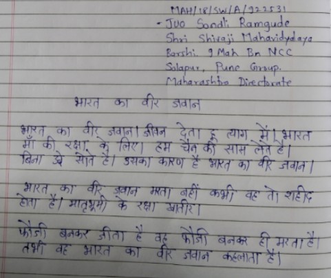 भारत का वीर जवान कविता JUO SONALI RAMDAS RAMGUDE SHRI SHIVAJI MAHAVIDYALAYA BARSHI REG. NO. MAH/18/SW/A/922531 9 MAH BN NCC SOLAPUR PUNE HQ GROUP MAHARASHTRA DIRECTORATE