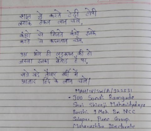 JUO SONALI RAMDAS RAMGUDE SHRI SHIVAJI MAHAVIDYALAYA BARSHI REG. NO. MAH/18/SW/A/922531 9 MAH BN NCC SOLAPUR PUNE HQ GROUP MAHARASHTRA DIRECTORATE