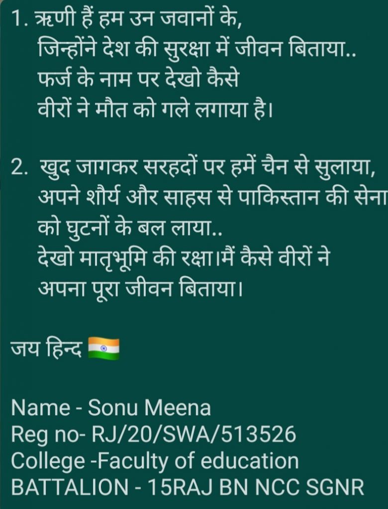 I am sonu meena ncc cadet from 15 raj battalion Sri ganganagar. I am graduating from tantia university.