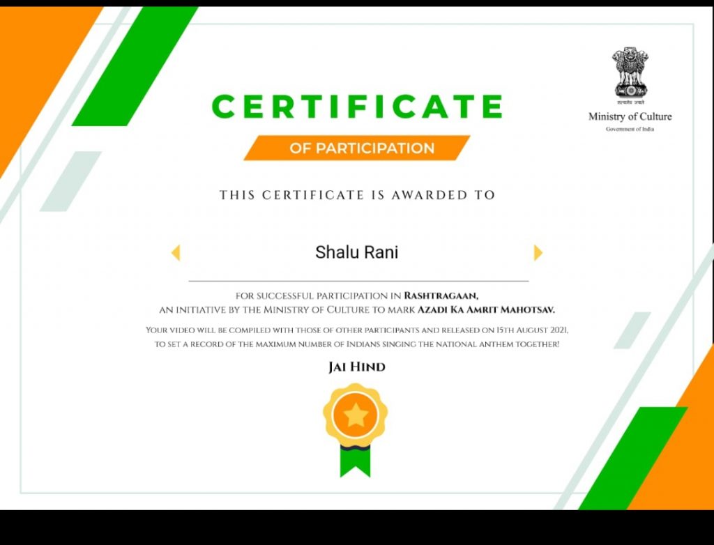 राष्ट्रगान मे सहभागिता कर प्रमाण पत्र प्राप्त किया l