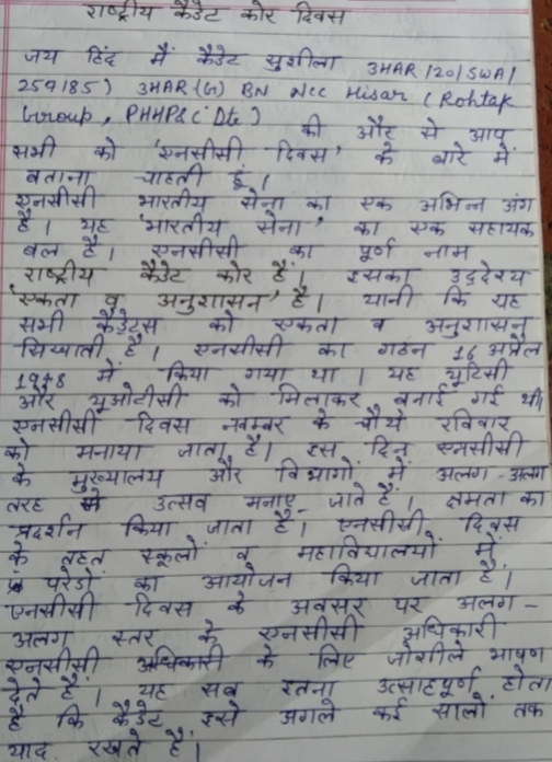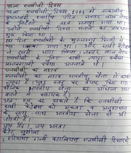 जय हिंद मैं कैडेट सुशीला आज आपको हमारे एनसीसी दिवस के बारे में बताना चाहती हूं।