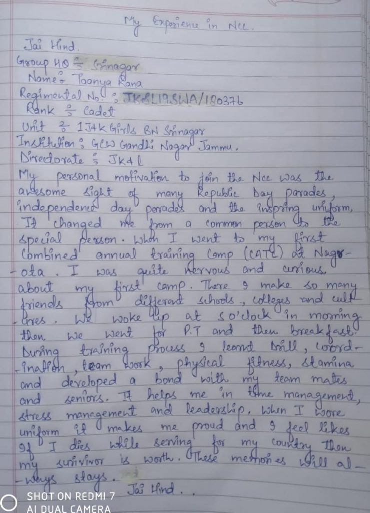 I cadet Taanya Rana from GCW Gandhi nagar jammu .Regimental no. JK&L19SWA/180376. I am sharing my experience about Ncc.