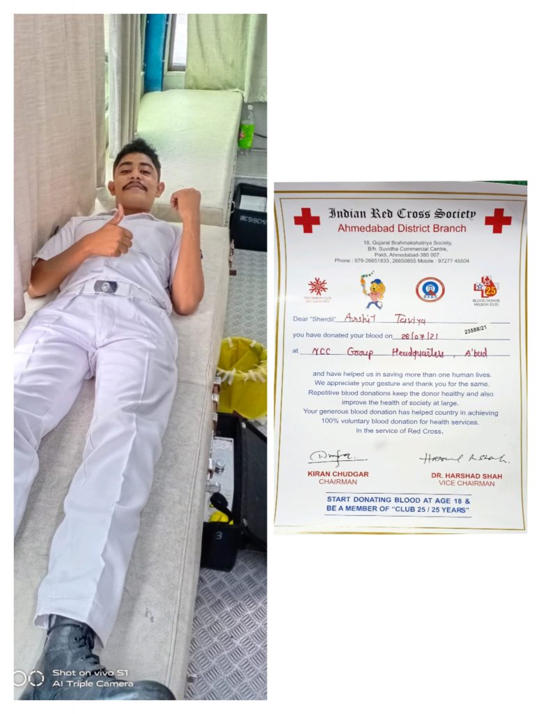 On Kargil Vijay diwas, Gujarat Directorate 1 GUJ. Naval unit , Ahmedabad group host blood donation camp. Honorable education minister of Gujarat Bhupendra Singh Chudasama visited and all cadets and respected officers donated the blood. Jai hind