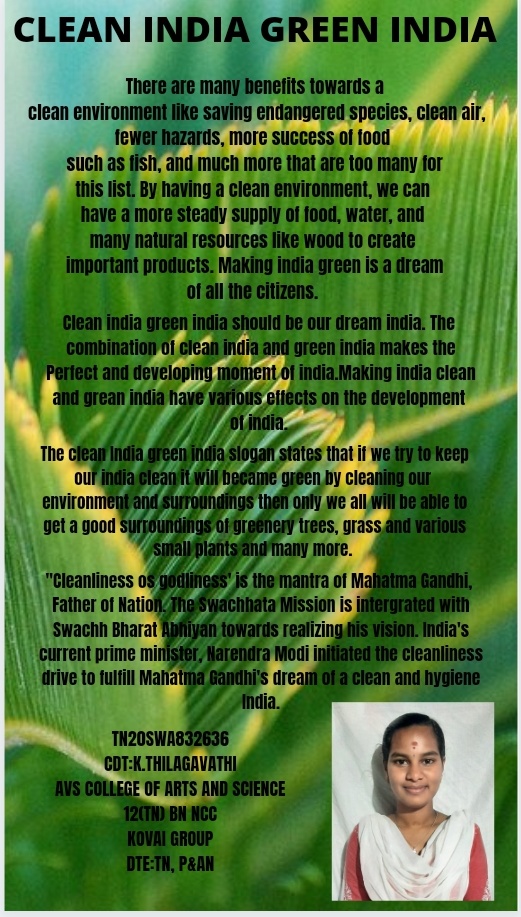 TN20SWA832636 CDT:K.THILAGAVATHI AVS COLLEGE OF ARTS AND SCIENCE 7/12,COY 12(TN) BN NCC KOVAI GROUP DTE:TN,P&AN