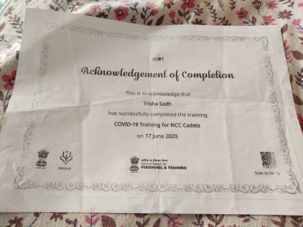 Certificate of completion of training of COVID-19 for NCC Cadets on 17june 2020