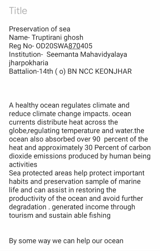 Preservation of sea is needed to all the people in the world , because without Sea reservation we can't stay healthy
