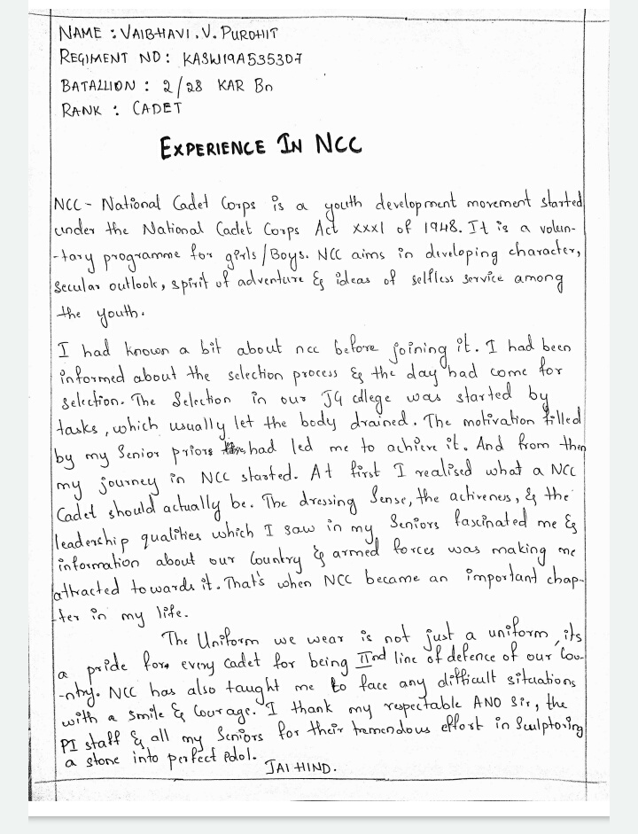 I am Cadet Vaibhavi Purohit. Above is the article on my experience in NCC.