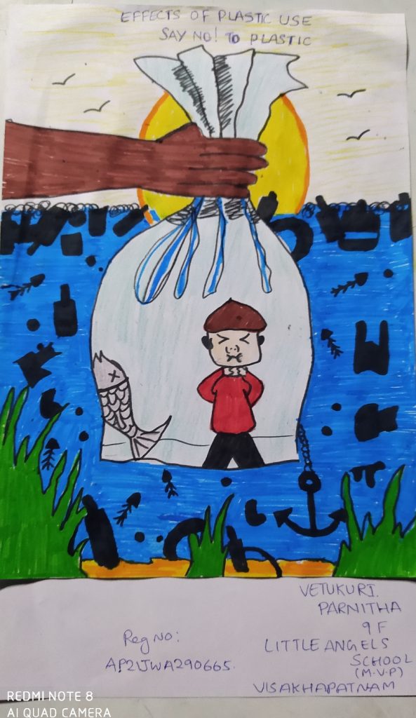 I cadet VETUKURI.PARNITHA of class 9th-F .LITTLE ANGELS SCHOOL (M.V.P COLONY) VISAKHAPATNAM A.P .This is my painting on theme EFFECTS OF PLASTIC USE