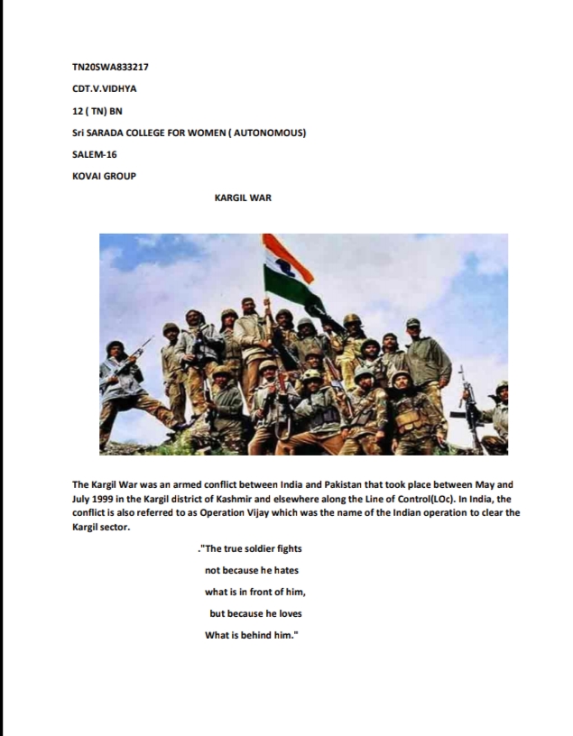 KARGIL WAR TN20SWA833217, CDT. V.VIDHYA, 12(TN)BN , NCC , SRI SARADA COLLEGE FOR WOMEN ( AUTONOMOUS) , SALEM - 16 ,
