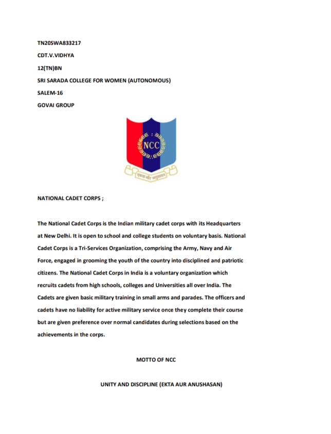 NATIONAL CADET CORPS TN20SWA833217, CDT. V.VIDHYA, 12(TN)BN , NCC , SRI SARADA COLLEGE FOR WOMEN ( AUTONOMOUS) , SALEM - 16 ,