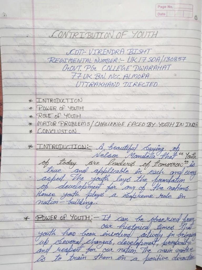 CADET- VIRENDRA BISHT ENROLLMENT NUMBER- UK17SDA130857 FATHER NAME- HEERA SINGH BISHT COLLEGE- GPGC DWARAHAT ALMORA BATTALION- 77 UK BN. NCC ALMORA HQ- NAINITAL DIRECTED- UTTARAKHAND DIRECTED