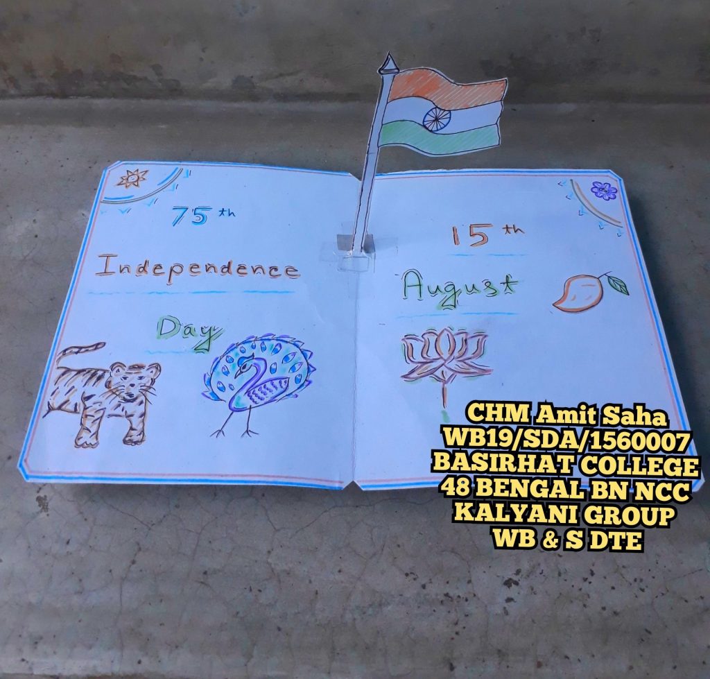 CHM AMIT SAHA WB19/SDA/1560007 BASIRHAT COLLEGE 48 BENGAL BN NCC KALYANI GROUP WB & S DTE. This is my handmade Greetings Card on National Flag - Animal - Bird - Flower - Fruit for 15th Aug.