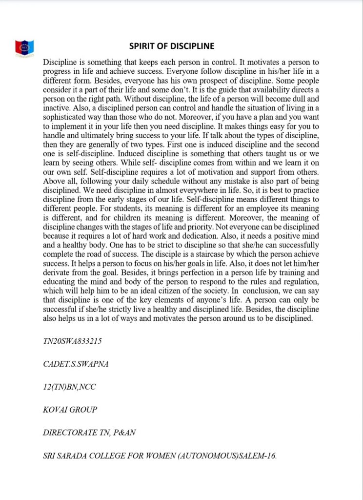 CADET.S.SWAPNA TN20SWA833215 SRI SARADA COLLEGE FOR WOMEN (AUTONOMOUS)SALEM-16. 12(TN)BN NCC, KOVAI GROUP, TN,P& AN DTE.
