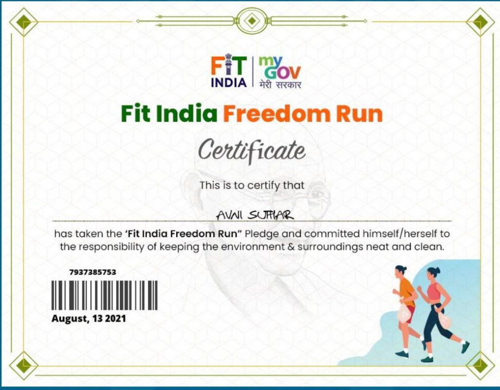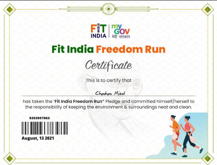 MY CONTRIBUTION BY A CERTIFICATE" FIT INDIA FREEDOM RUN " 2021