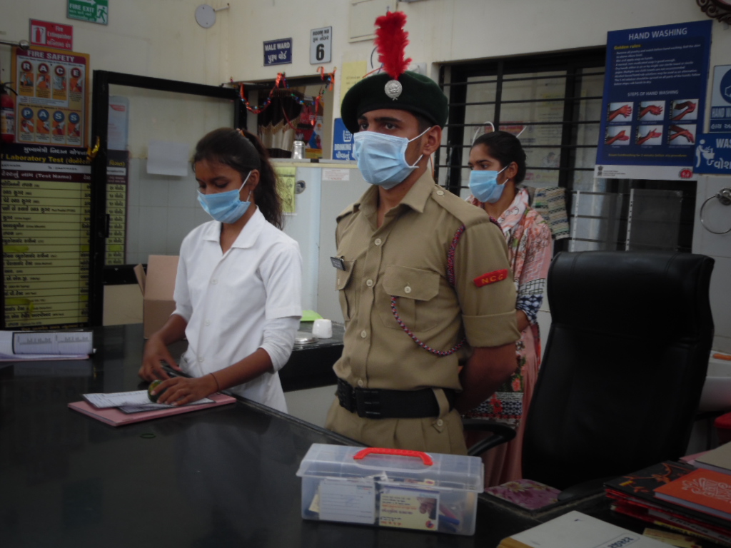 GUJ/SD/18/111208 , CADET BODANA ARVINDBHAI , 35 GUJ NCC BN , G.D. MODI COLLEGE OF ARTS , PALANPUR THE STUDENTS TOOK PART IN ACTIVITIES AT LOCAL COVID CENTER .