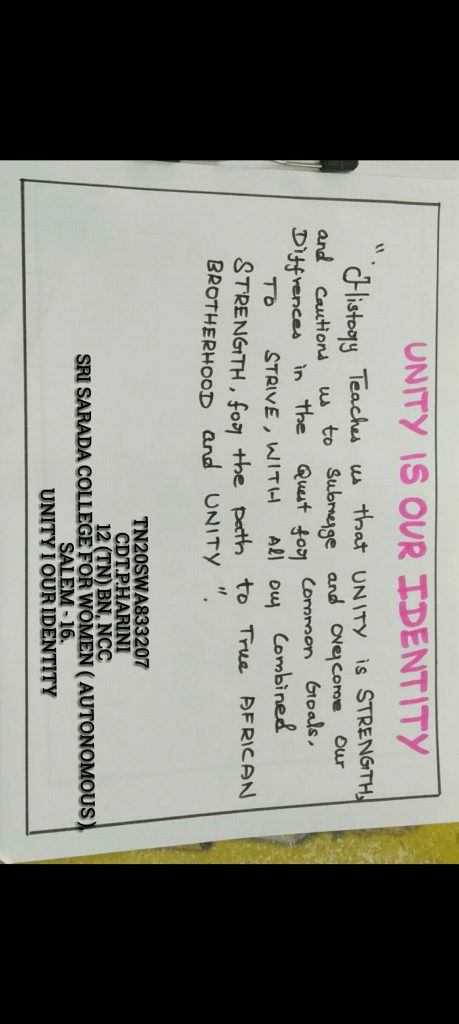 Rank&Name: CDT.P.Harini , Reg no: TN20SWA833207 Clg name: Sri Sarada College For Women (Autonomous) , Salem – 16. 12(TN)BN NCC, KOVAI GROUP, TN,P& AN DTE . Unity is our identity