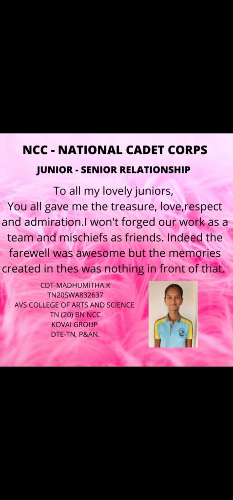 TN20SWA832637 CDT:MADHUMITHA.K AVS COLLEGE OF ARTS AND SCIENCE 12(TN)BN NCC KOVAI GROUP DET:TN,P&AN