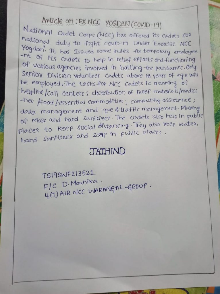 Name: SHRIRAM. VISHNU. HEGDE Rank : CDT Register no.:KA19SDA554767 Unit: 29 KAR NCC GP. HQ. : BELAGAVI Dte.: Goa & Karwar
