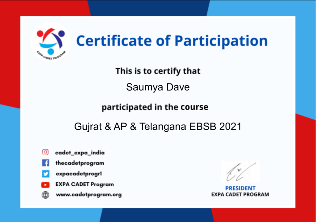 I am PO CADET Saumya Dave, Student of Darshan University & No. 8 Gujarat Naval Unit NCC-Jamnaga. I have completed my expa cadet training program in my ebsb camp with AP & T state.