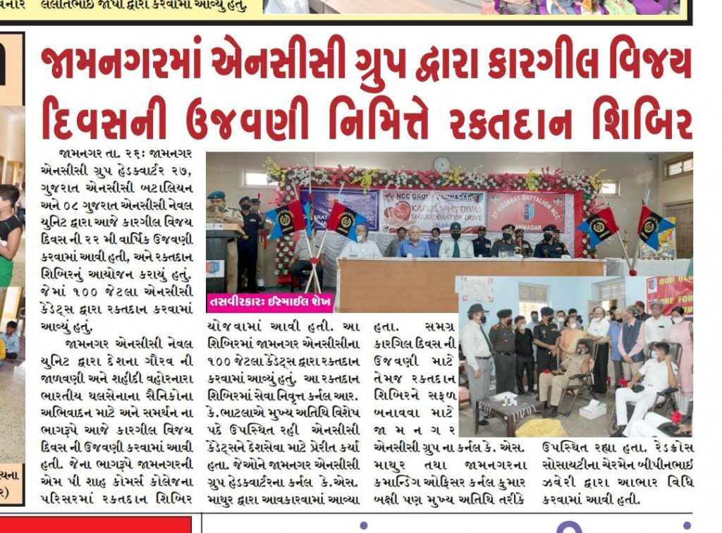 I am CADET Vaidehi Shingala, Student of Darshan University & No. 8 Gujarat Naval Unit NCC-Jamnaga.On 26th July i attended KARGIL VIJAY DIWAS Blood donation drive at MP Shah commerce College at jamnagar.