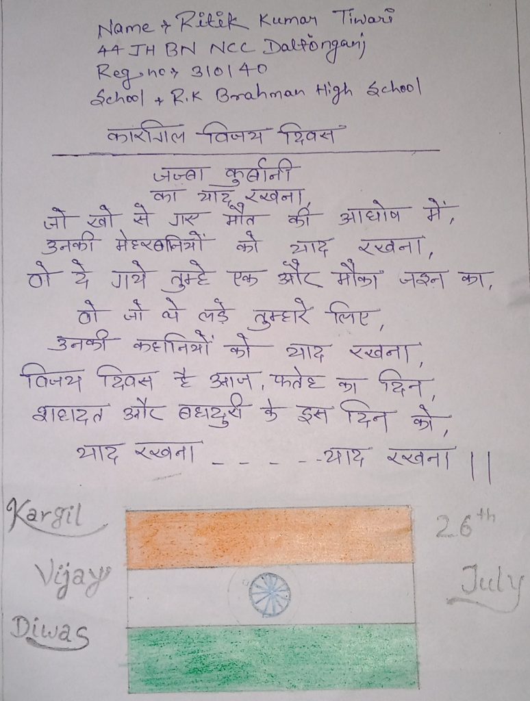 Name- Cadet Ritik kumar Tiwari. 44JH BN NCC Daltonganj. RK Brahman High School Medininagar (Jharkhand) Regi no.- 310140