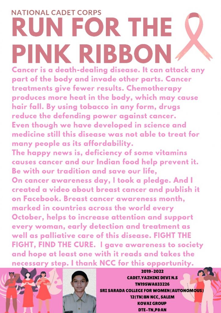 THIS IS L/CPL.N.S. YAZHINI DEVI FROM SRI SARADA COLLEGE FOR WOMEN (AUTONOMOUS), SALEM -16. I BELONG TO 12 (TN) BN, COIMBATORE GROUP. THIS IS AN ARTICLE REGARDING MY CANCER AWARENESS EXPERIENCE.