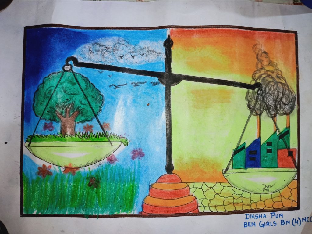 This is Diksha Pun of Class VII A Roll No. 2 UNIT- BEN GIRLS BN (4) NCC. The theme of the poster is POLLUTION DUE TO URBANIZATION