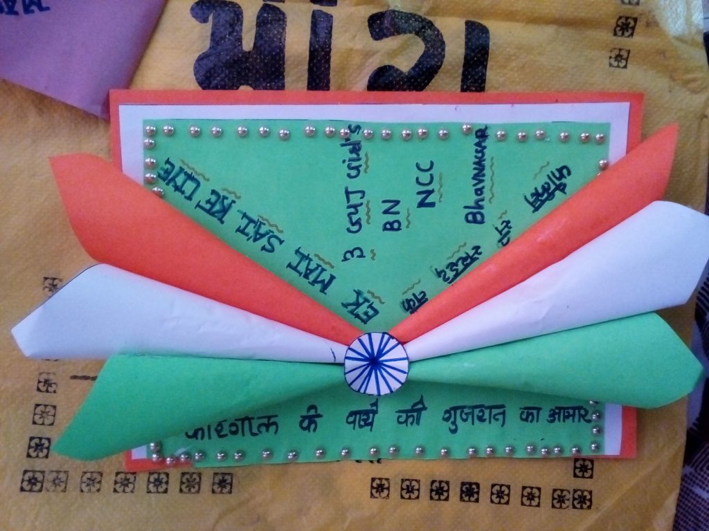 I'm UO Parmar Jyoti from 3 Gujarat Girl's BN NCC Bhavnagar prepared greettings Cards for Brave soldiers on Kargil Vijay diwas in ek mai sau ke liye phase v compaign.