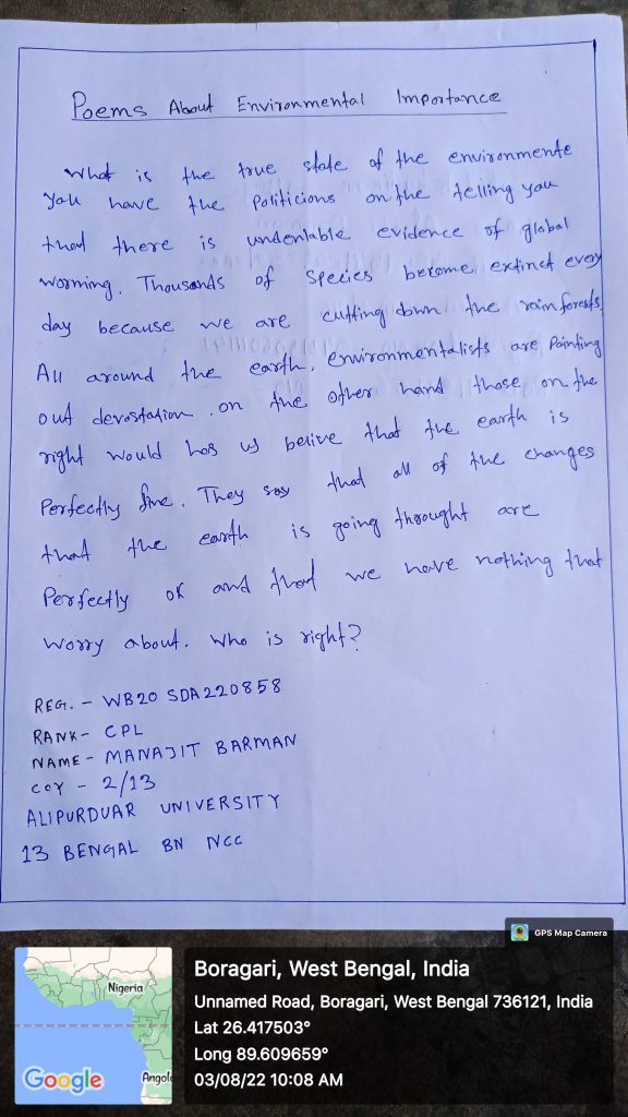 I am CPL Manajit Barman from Alipurduar University COY 2/13 Bengal BN NCC this is my poem about Environmental Importence