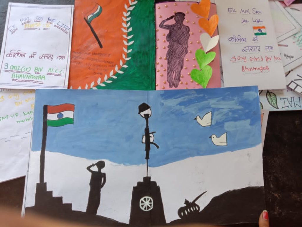 I am cedet baral srushti from 3 Gujrat girl's Bn Ncc Bhavnagar prepared greetings Card for brave soldiers on kargil Vijay divsh in Ek Mai Sau ke liye phase v campaign