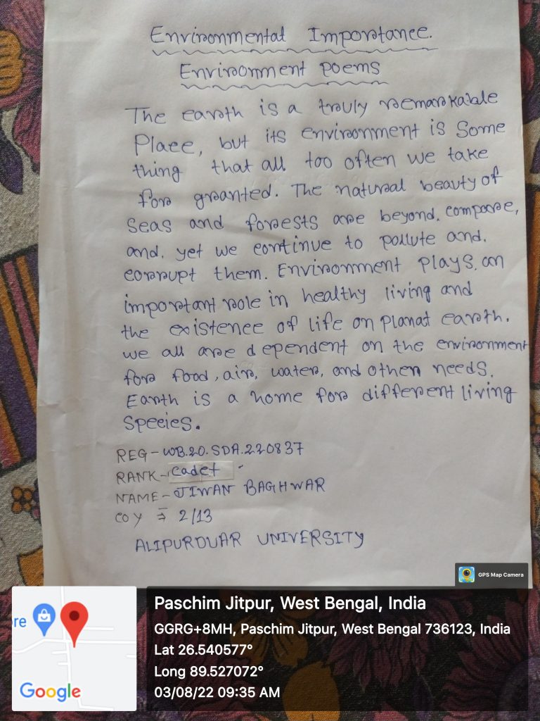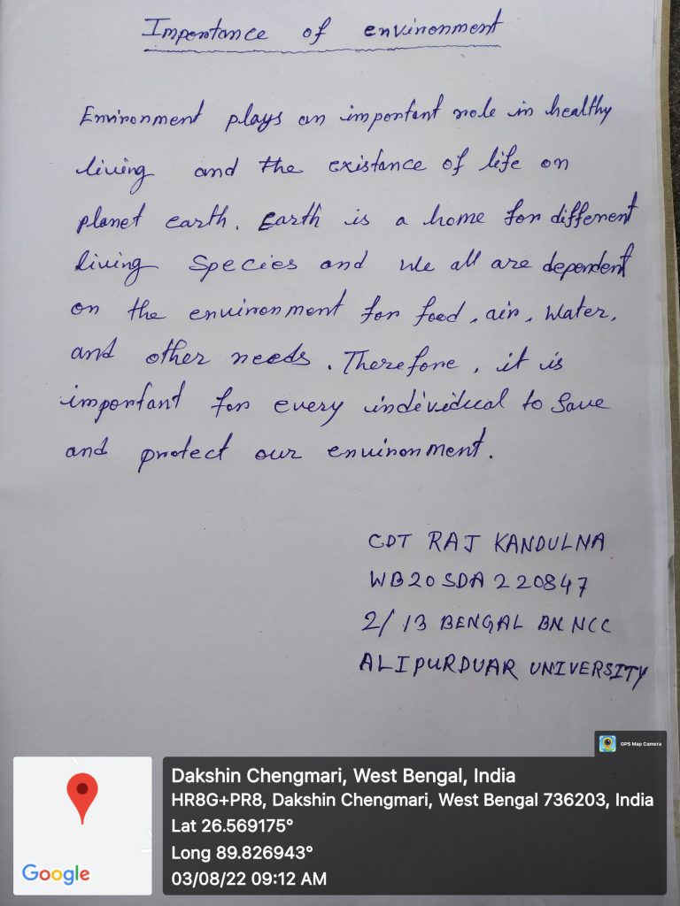 Iam CDT RAJ KANDULNA, COY 2/13 BENGAL BN NCC, ALIPURDUAR UNIVERSITY. This is my short Gidense important of environment