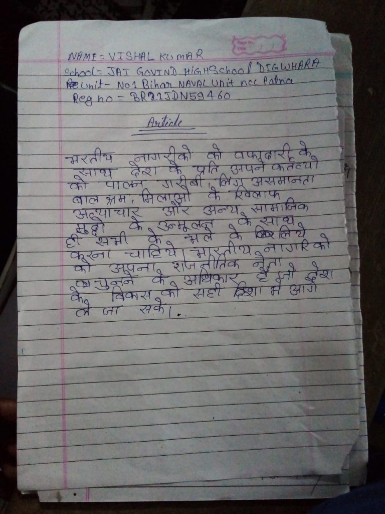 My name is cadet yuvraj from 1 Bihar naval unit ncc patna. Reg no. BR20SDN590060