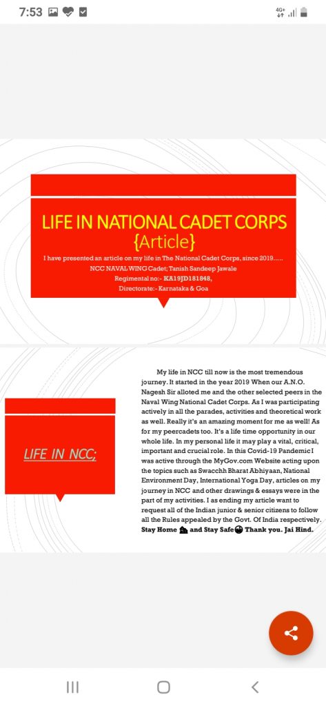 Cadet: Prajwal R D Reg No.:KA19SDA551610 I am studying in Govt. Polytechnic college, Karwar Unit: 29 kar bn ncc, Karwar