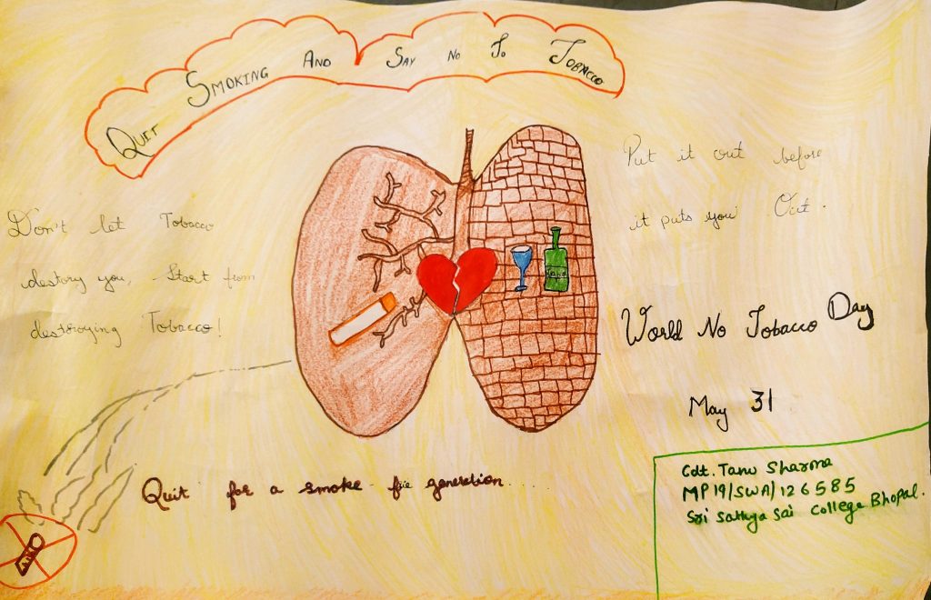 I CDT TANU SHARMA MP19/SWA/126585 4MP GIRLS BN BHOPAL From SRI SATHYA SAI COLLEGE FOR WOMAN Bhopal I have Poster on World No Tabcco Day.