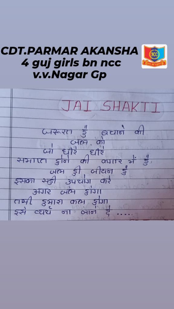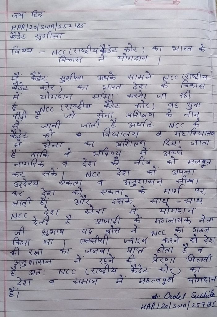 जय हिंद कैडेट सुशीला एनसीसी भारत देश को मजबूत बनाने में महत्वपूर्ण योगदान देती है।