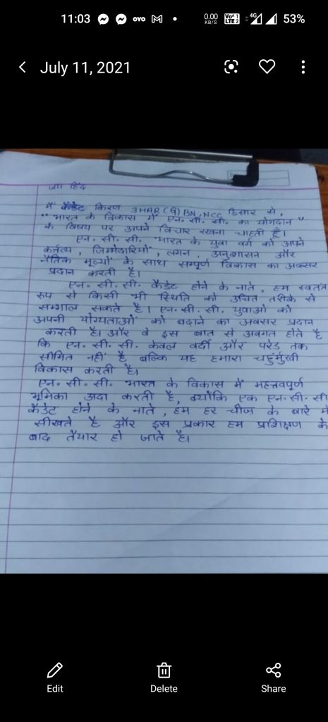 कैडेट किरण थ्री हरियाणा गर्ल्स बटालियन,एनसीसी, फतेह चंद महिला महाविद्यालय, हिसार।