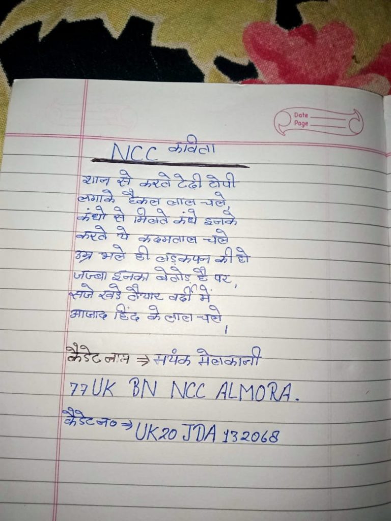 Cadet Priti Melkani Regiment number UK20JWA132100 100 presented by 77 UK battalion NCC mutyapathar Almora