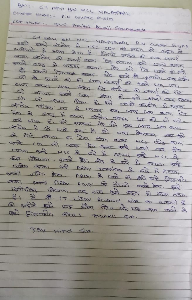 JUO arvind ghungrude CDT Arjun Rathod and CDT Shashank Ramakant Mishra witnessed the program on the paper they wrote complete information about social service program which held by NCC cadets of PN clg pusad under the guidance of lt. Vijay Rathod sir