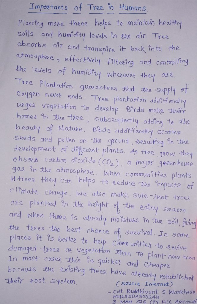 Importance of trees in Humans life and to save our earth from global warming. Tree plantation drive undertook at 14 different location under 3 MAH SIG COY NCC Amravati