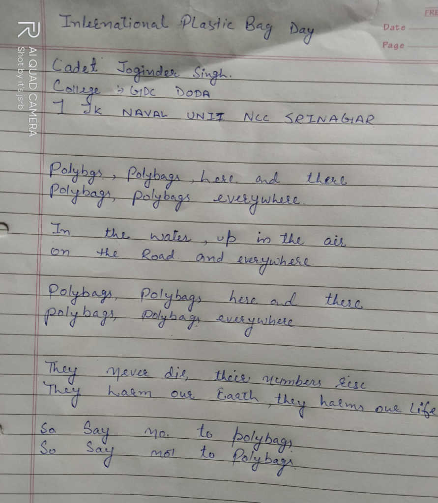 I Cadet Joginder singh from Gdc doda 1jk naval unit Ncc Srinagar Jammu Kashmir and ladakh directorate. written a poem on international no plastic bag day